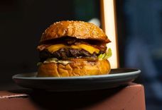 400 г • Котлета из говядины, чатни из персика, копченый сливочный сыр, салат, томат, мята, соусы фирменный и BBQ.